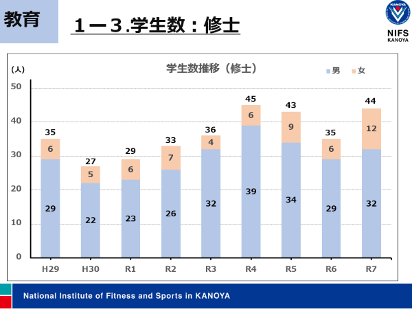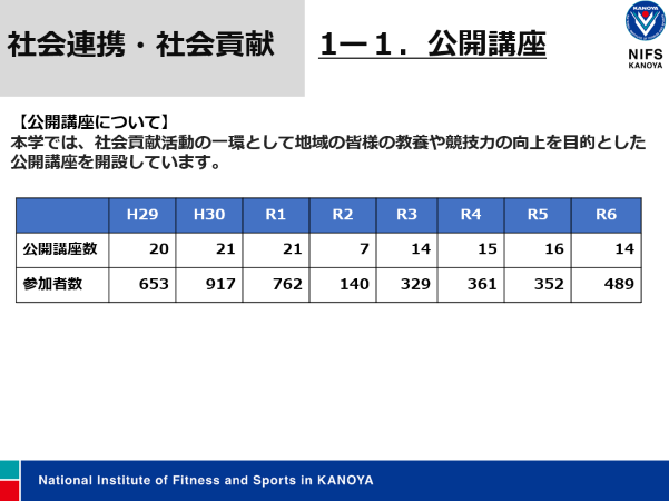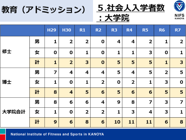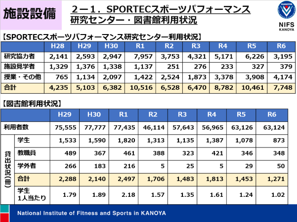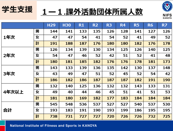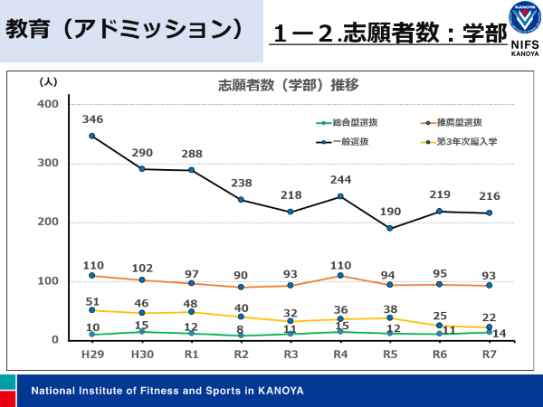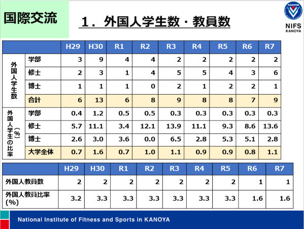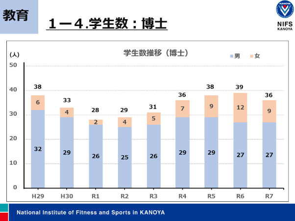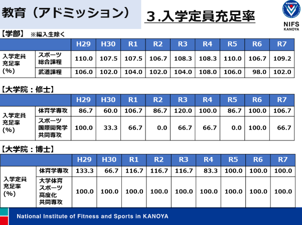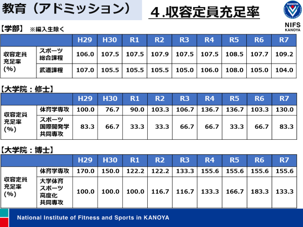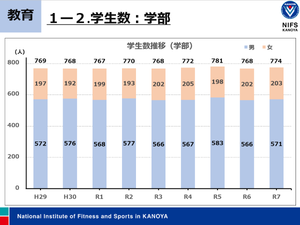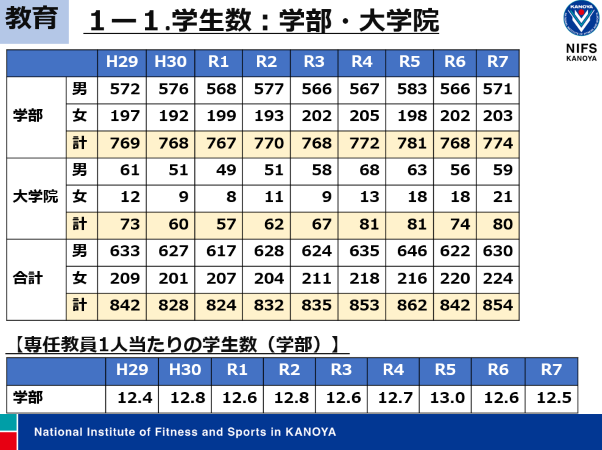 鹿屋体育大学 Fact Book【学外版】は、鹿屋体育大学 IR 室にて作成しているもので、本学における教育・研究等に関する基礎的なデータを取りまとめ、経年での推移を可視化したデータ集になります。