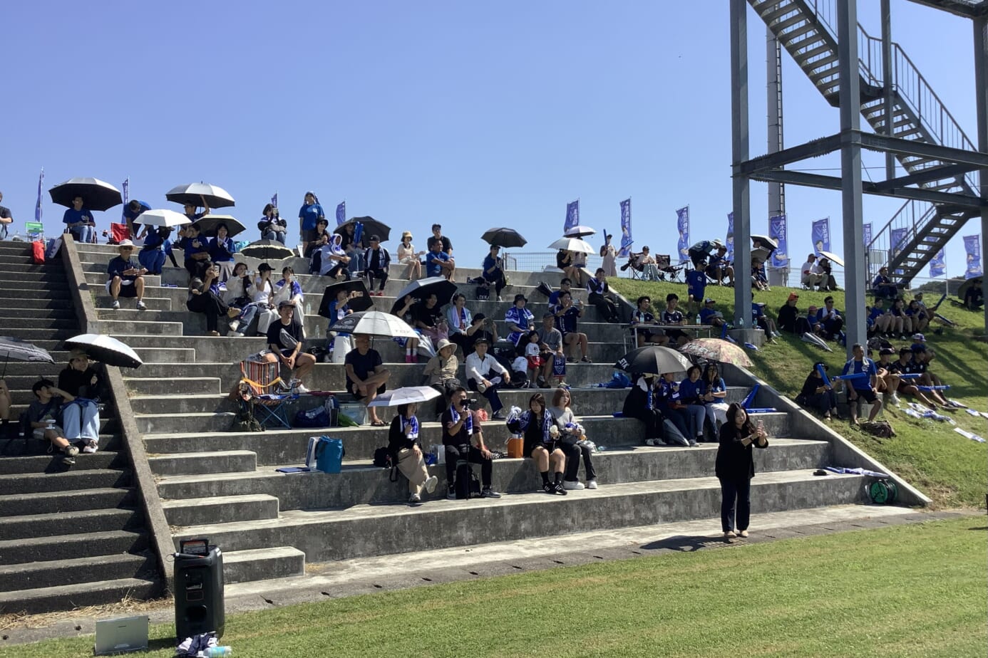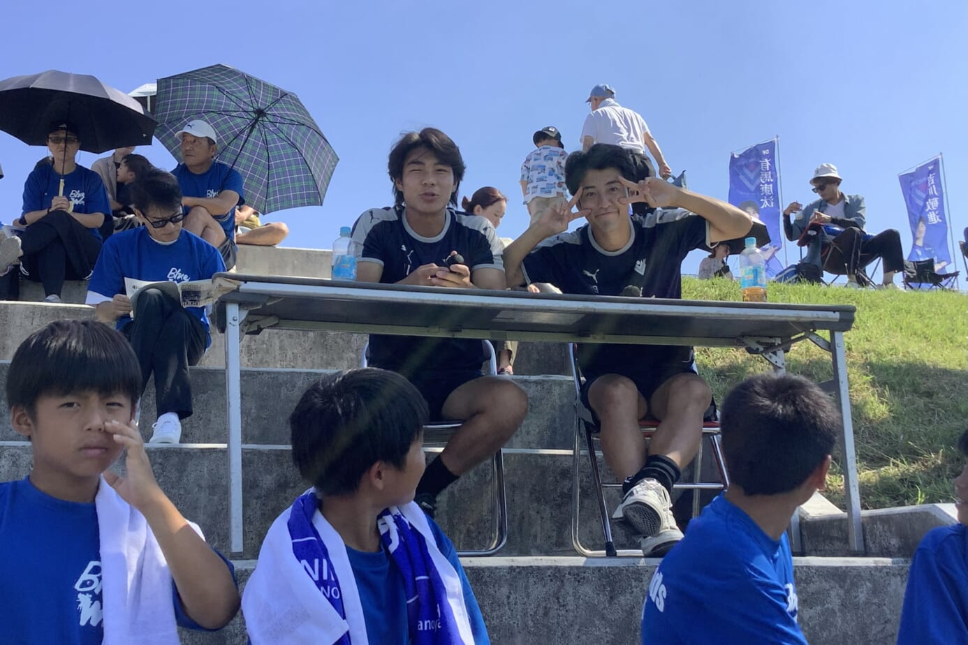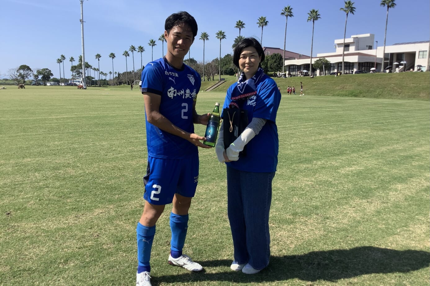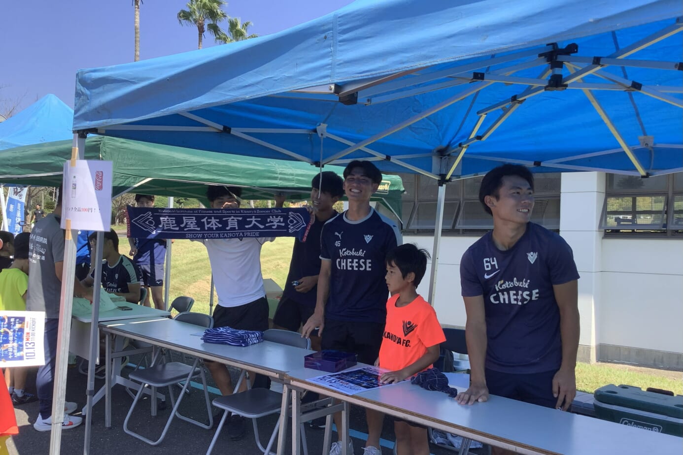 今回はサッカー部独自イベントとしてトレーニングシャツの古着販売や、オリジナルスポーツタオルの販売などもサッカー部の学生たちが行いました。販売を担当した上地慶さん(同4年)は「鹿屋在住のさまざまな世代の方々と触れ合えたことが楽しかったです」、大山航平さん(同1年)は「運営の立場から、皆さんに楽しんでもらえるように努めました。販売もうまくいき、試合も勝ってみなさんに楽しんでもらえてよかったです」、原佳太朗さん(同4年)は「300人近い方々に来ていただき、運営もうまくいってよかったです」、寺本雄哉さん(同4年)は「学外のお客様と関わる機会があって、鹿屋体育大学を認知してもらえるなど、活動を通して活動を通して広報に携わることができてとてもいい経験になりました」と振り返りました。