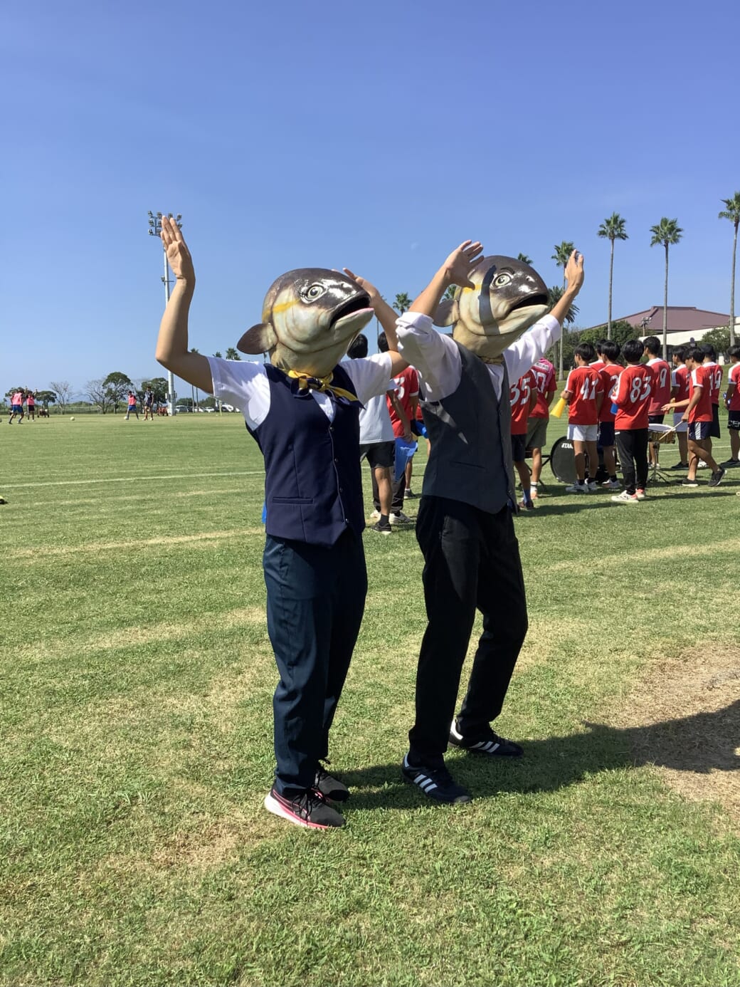 試合の解説を務めたのはサッカー部の塩入太陽さん(スポーツ総合課程3年)と竹田就太さん(同3年)の2人で、同じサッカー部の仲間ならではの選手のエピソードも交えながらの掛け合いは、プロ顔負けのうまさで応援席を笑いの渦に包みこんでいました。ハーフタイムには鹿屋市PR特命係長「かのやカンパチロウ」の部下、「かのやカンクロウ」と「かのやカンナナ」の2人が、パフォーマンスを披露しました。