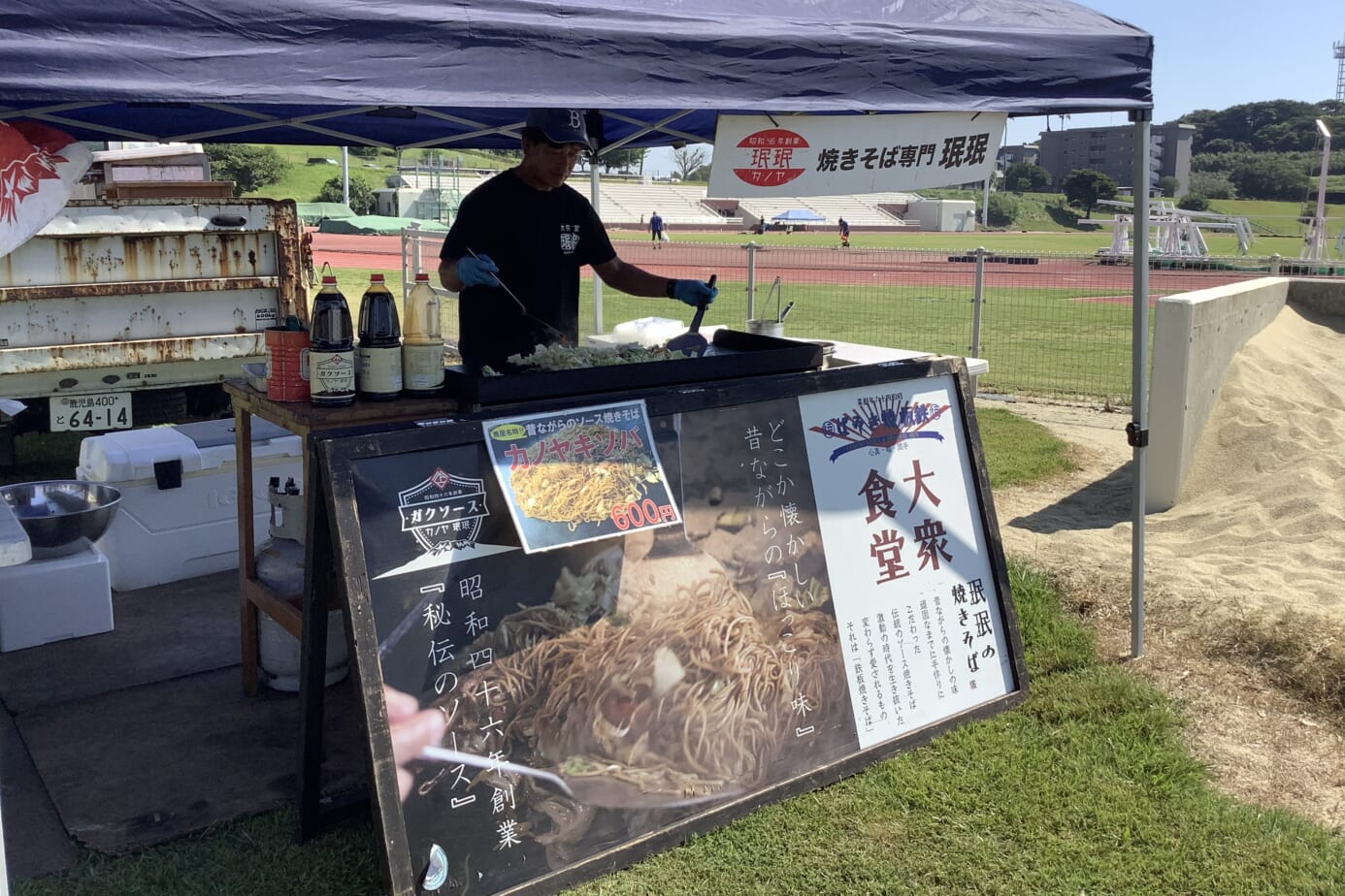 受付では先着150人にBlue Winds Tシャツやタオル、応援バルーン、選手名鑑などが記された冊子が配られ、推し選手投票をしてくださった方を対象にガラポン抽選会が行われました。また、「珉珉」の焼きそばと「Crepe MUCCA」のクレープがスタジアムグルメとして販売され、好評を博していました。