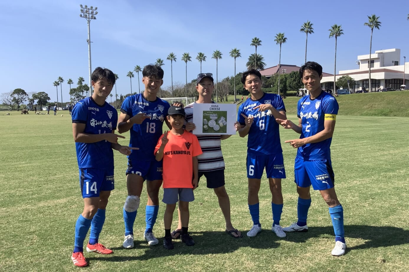 試合終了後は選手交流イベントとしてハイタッチ会、サッカー部協賛社商品や鹿屋体育大学サッカー部出身のプロ選手からの商品提供の抽選会、推し選手の結果発表が行われました。推し選手1位に輝いたのは野村祐睴さん、2位は畠中健心さん(同4年)、3位はサッカー部主将の戸田峻平さん(同4年)でした。