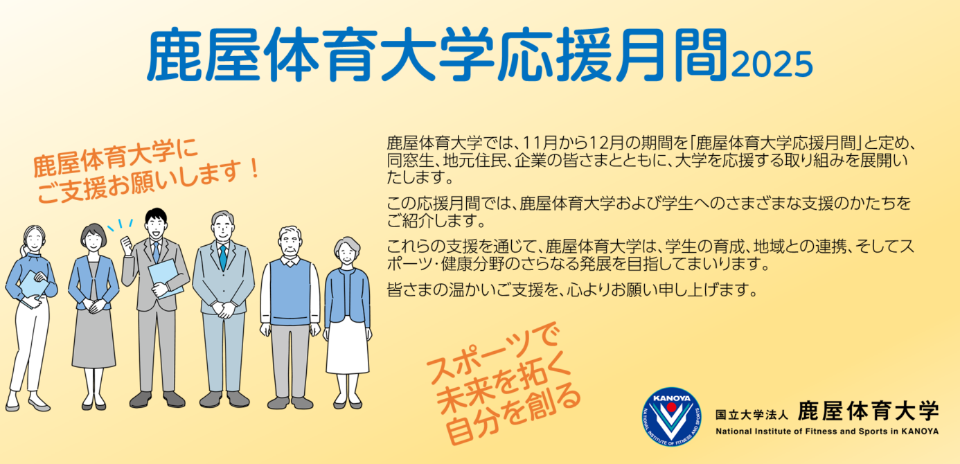 鹿屋体育大学では、11月から12月の期間を「鹿屋体育大学応援月間2025」と定め、大学(および学生、課外活動団体、研究)などへのさまざまな支援のかたちを、11/14(投稿初日)から毎週5回にわたり、今年からの新しい情報について、ご紹介させていただきます。