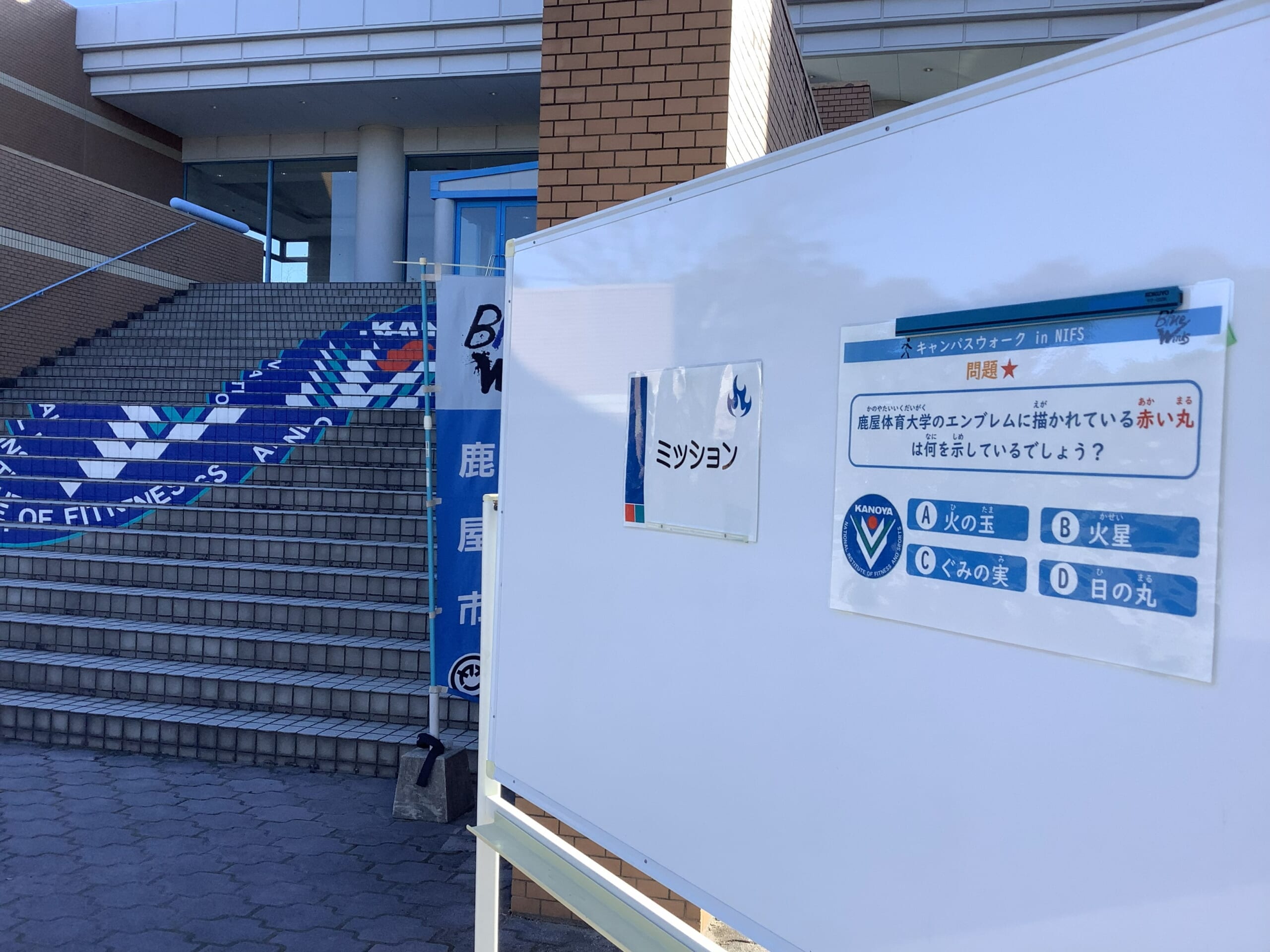 受付開始9時30分前から行列ができ、参加者は受付でミッションウォーキングのMAP・スタンプラリー付き解答用紙、大塚製薬提供の「ボディメンテゼリー」をもらうと、それぞれのグループごとに大学内に設置されたミッション(クイズ)を巡りつつ、学内ウォーキングにトライしました。用意されたミッションは「水野講堂前のエンブレムと開聞岳を撮影しよう!」「SPORTECスポーツパフォーマンス研究センターに入ろう!」「ウォーキングチャレンジ@陸上競技場横」「やしの木の数を数えよう!@テニスコート付近」「鹿屋のおすすめの場所を共有しよう!@講義棟205教室」「Exseedにチャレンジしよう!@バドミントン練習室」「BMIを測定してみよう!@大学院棟1階ギャラリー」の7つ。18問のクイズは武道館前や野球場前など学内の至る所に設置されており、参加者はウォーキングを楽しみながらクイズを探してクロスワードに答えを埋める作業をしていました。