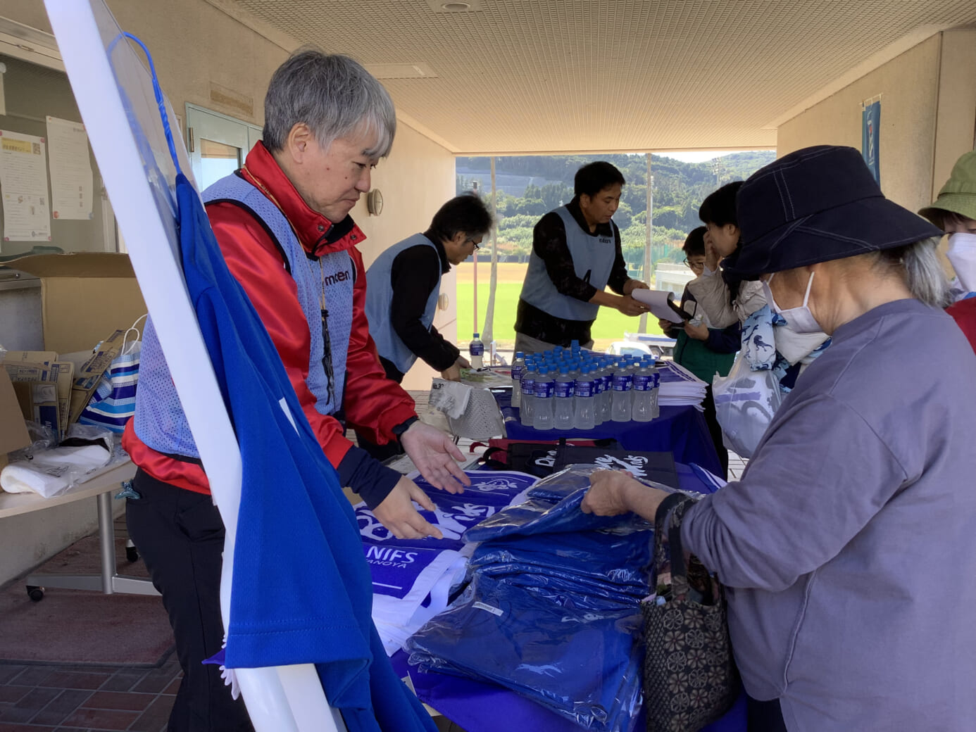 ゴールではスポーツタオルとコカ・コーラ社提供のアクエリアスが参加者全員に渡され、クロスワードパズル正解者とスタンプラリー4個以上の獲得者には、シートクッション、Tシャツ、てぬぐい、フェイスタオルのBlue Windsグッズ4種類の中から好きな商品1つがプレゼントされました。その後は場所を学生食堂に移し、各チームごとにこの日限りのバイキングメニューを満喫していました。