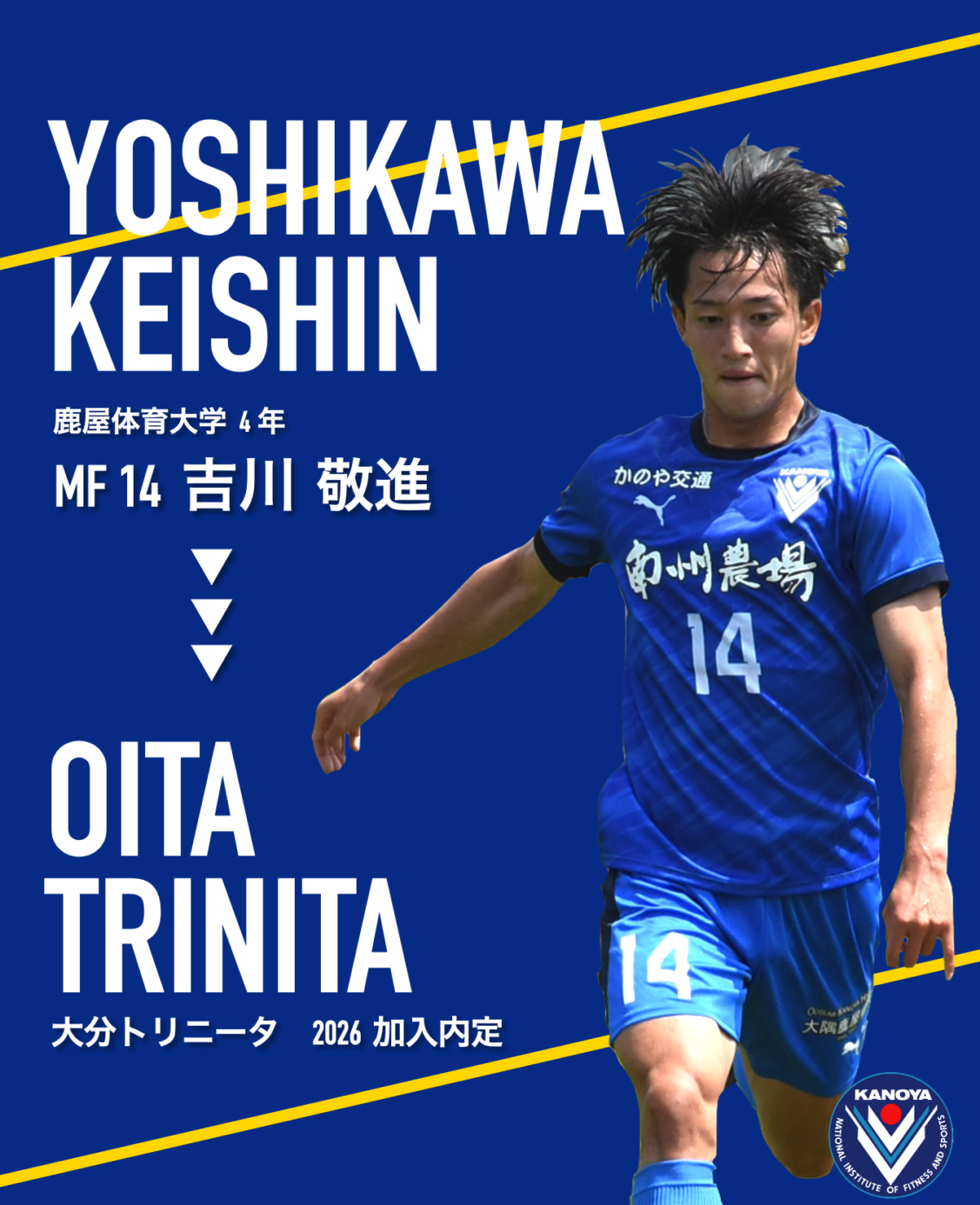 このたび、2026シーズンより大分トリニータに加入することになりました。 鹿屋体育大学の吉川敬進です。 幼い頃からの夢であったプロサッカー選手としてのキャリアを、大分トリニータという素晴らしいクラブでスタートできることを大変うれしく思います。 どんな時も支えてくれた家族、サッカーの楽しさ、素晴らしさを教えてくださった指導者の方々、日々切磋琢磨した仲間をはじめとする全ての方々のおかげで今の自分があります。 これからも敬進という名前の由来のように、周りの人を敬いながら前に進み続け、成長していけるように日々努力します。 そして、支えてくださる方々への感謝を忘れず、1日でも早くチームの勝利に貢献できるよう全力を尽くします。 大分トリニータのファン、サポーターの皆さま、応援よろしくお願いします。 鹿屋体育大学サッカー部では、今シーズンも多くの方々の応援・ご支援のおかげで、日々素晴らしい環境の中でサッカーをさせて頂いております。 総理大臣杯の全国大会では1回戦で敗れてしまいましたが、その悔しさを力に変えて後期のリーグ戦やインカレの全国大会に挑み、結果という形で恩返しできるようチーム一丸となって頑張ります。 引き続き、鹿屋体育大学サッカー部の応援よろしくお願いします。 |