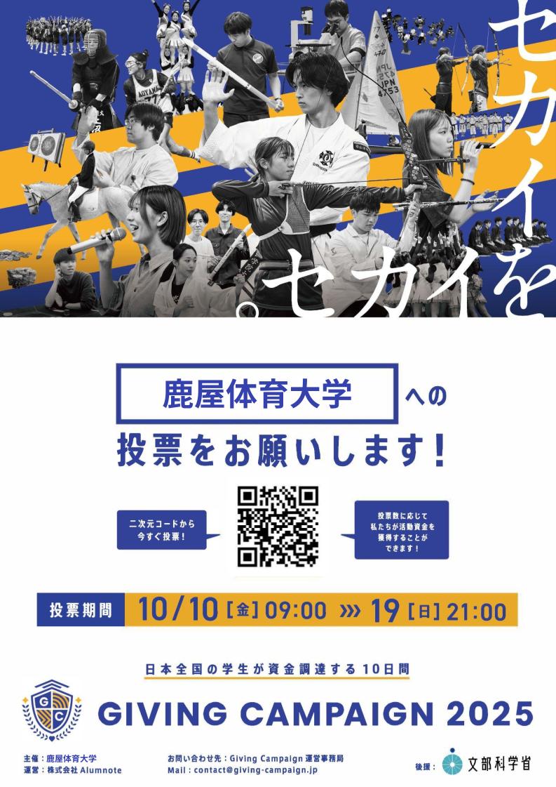 【概要】 ・期間:10/10(金)9:00 〜 10/19(日)21:00 ・Giving Campaign 2025公式サイト(全体ページ) :https://www.giving-campaign.jp/ ↓応援票の投票はこちらから! ・本学サイトURL:https://nifs-k.2025.giving-campaign.jp/ ・本学の参加団体:テニス部、女子バレーボール部、 男子バスケットボール部、女子バスケットボール部、 サッカー部、水泳部、柔道部、剣道部 |