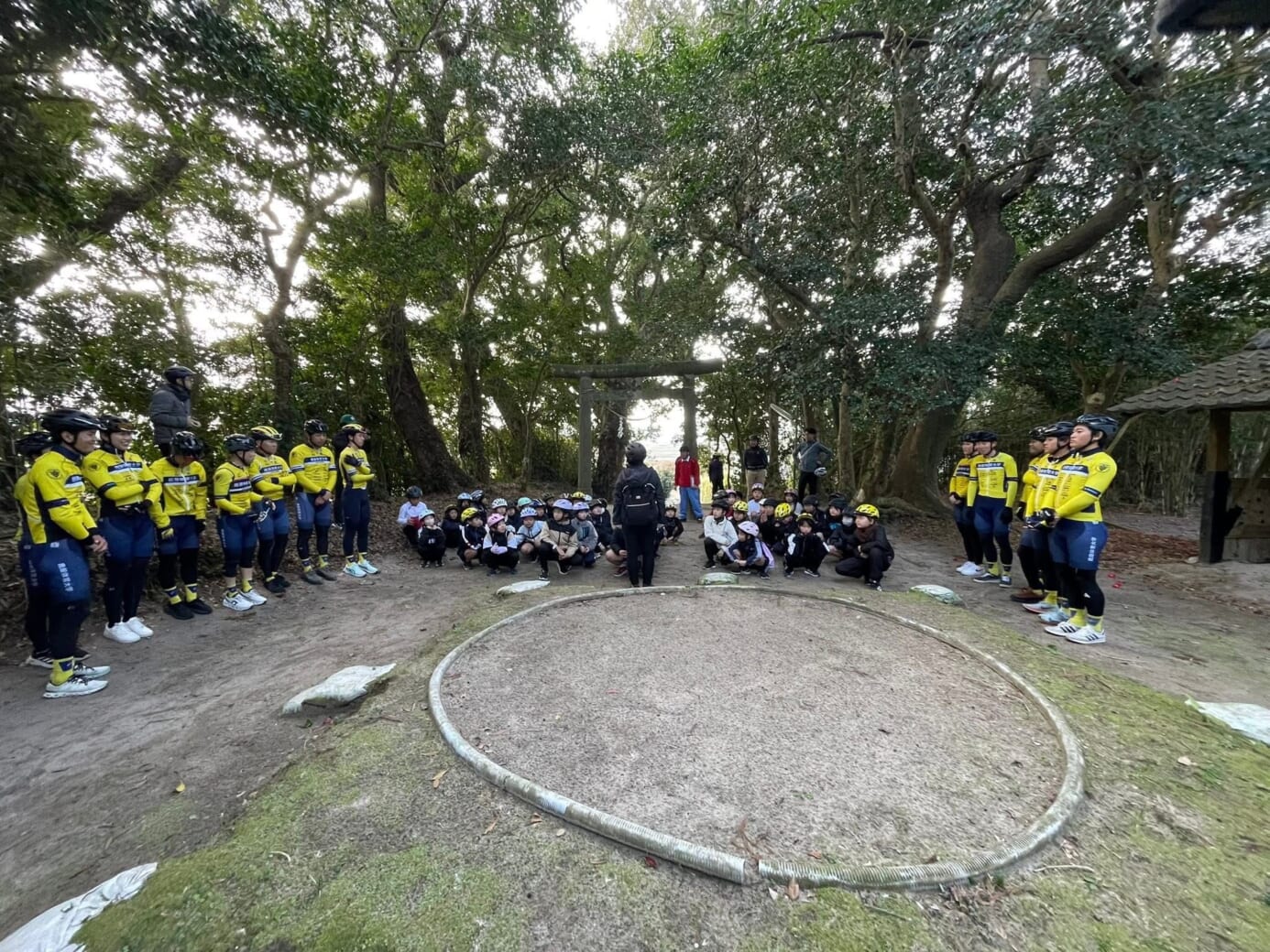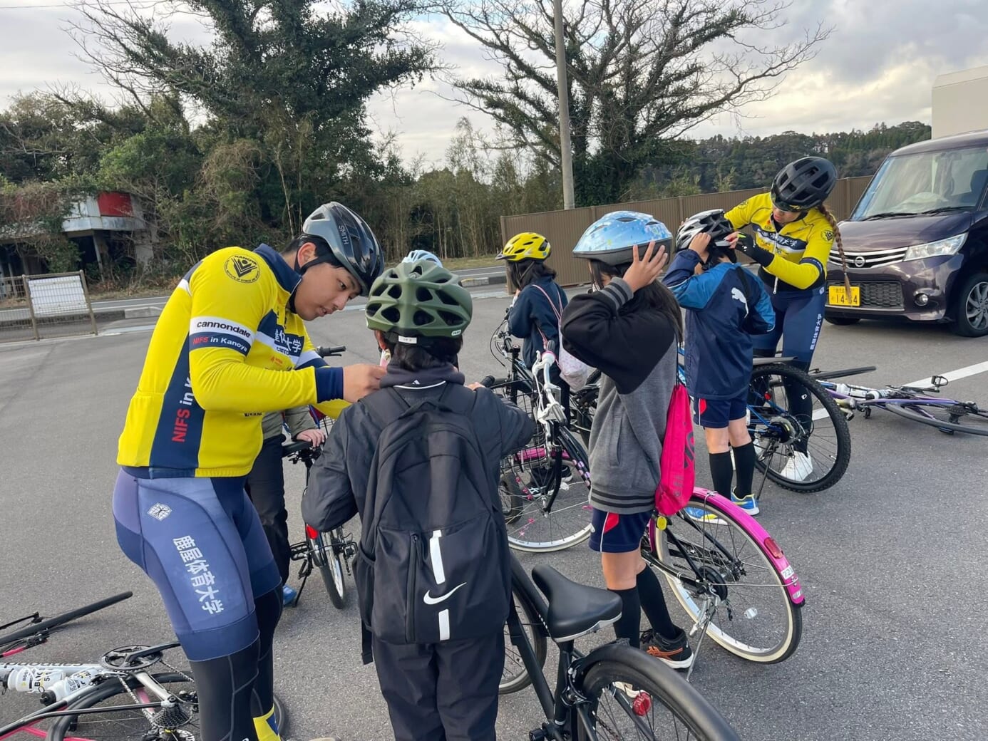 | 今回は、②「サイクリングで地域を巡る際の安全指導」の活動として、児童の皆さんと安全に配慮しながらサイクリング学習を実施し、地域の歴史や史跡を巡る貴重な機会となりました。 今年で3年目となる本活動には、鹿屋体育大学自転車競技部の部員14名が参加し、当日は天候にも恵まれ、実際に参加した子供達、学校関係者、保護者、行政職員等の皆様から温かいお言葉をいただきながら、私たちにとっても多くの学びと気づきを得られる充実した時間となりました。 自転車競技部は、毎週水曜日に実施される、地域の小中学生向け自転車教室「シエルブルー・エスポワール・サイクリングアカデミー」の指導補助を通じて、子供達への指導技術を行っています。 今回の金峰学園の授業でも色々な指導に活かすことができました。 |