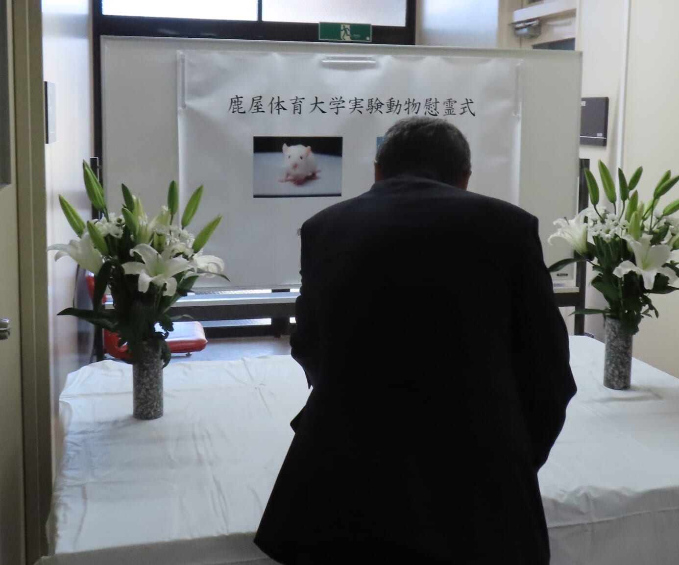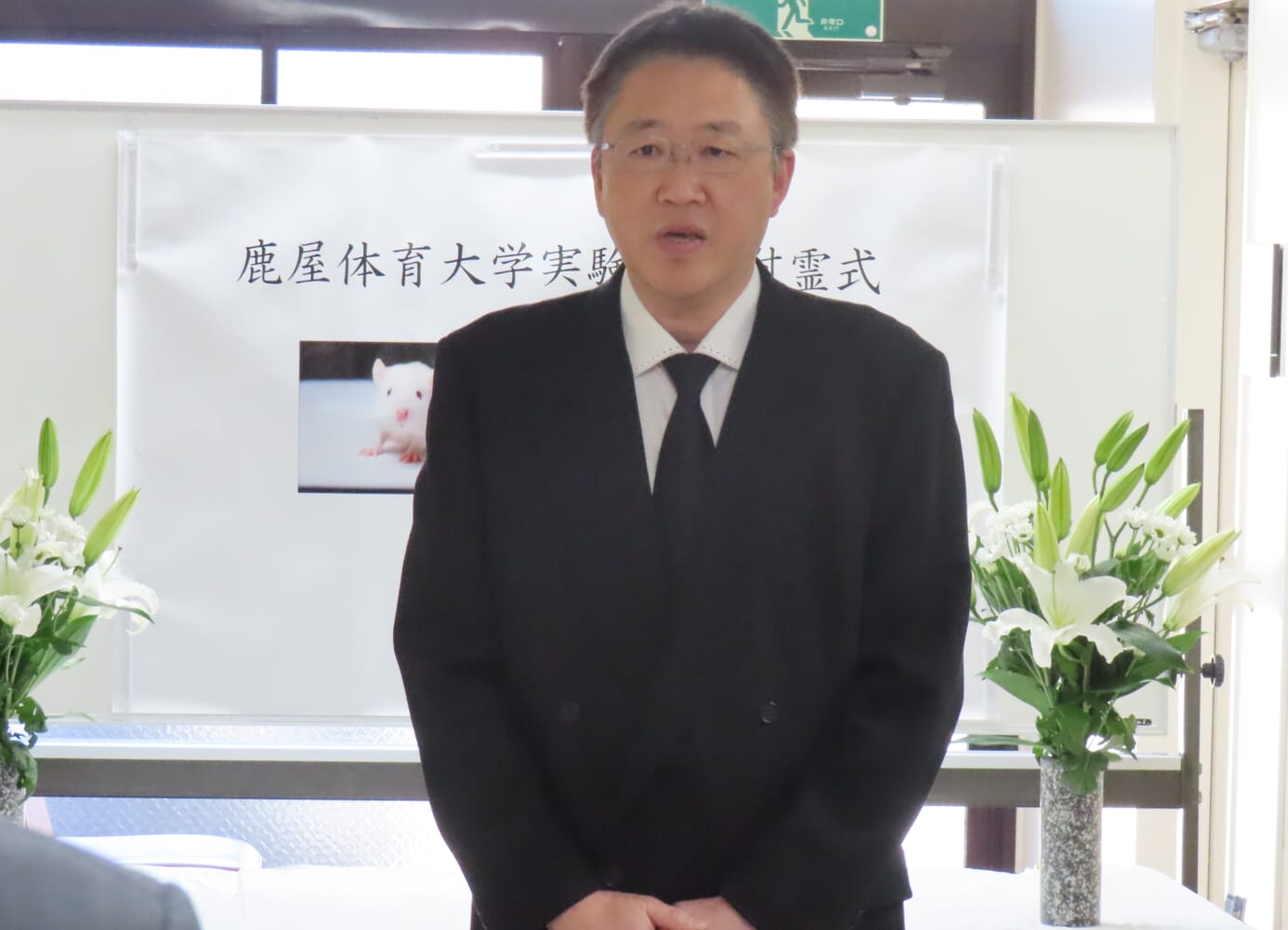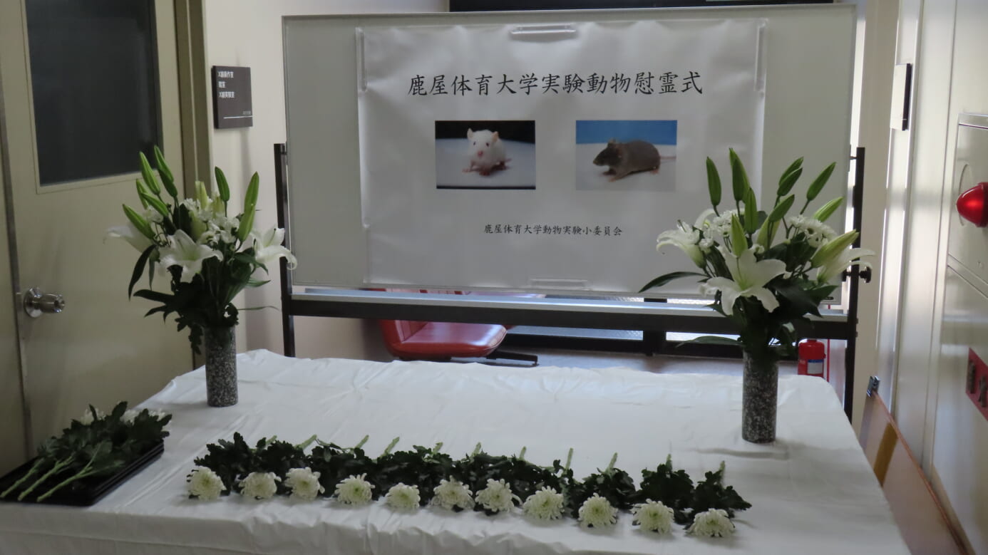 鹿屋体育大学実験動物慰霊式にあたり、本学の利用者を代表して、ここに謹んで慰霊の言葉を述べさせていただきます。令和7年度、本学において研究・教育の目的で実験に供された動物は、マウス68匹、ラット121匹を数えました。これらの尊い命の犠牲により貴重な研究成果や教育成果を得ることができました。実験動物の尊い犠牲の上に得られた貴重な情報を社会に貢献できる成果として発表し、還元することに努めてまいります。