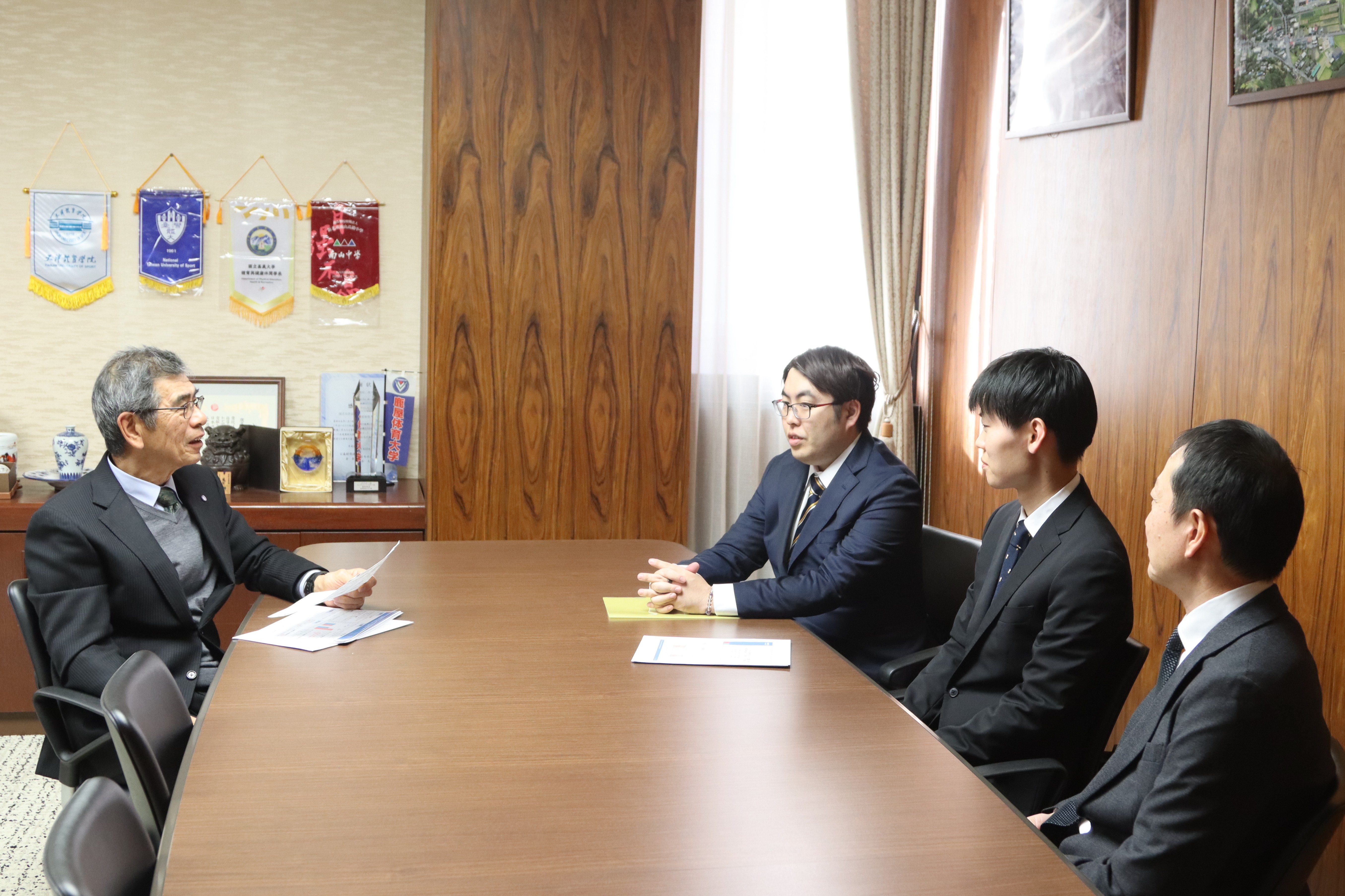 令和8年1月22日に、佐々木さんと今泉助教、和田教授が学長を訪問し、受賞報告を行いました。金久学長からは佐々木さんの受賞に関して激励するとともに、「トップアスリートの動きはデータ通りになることが少ない」などと、スポーツデータ分析の難しさや研究内容に関しての話題も挙がりました。