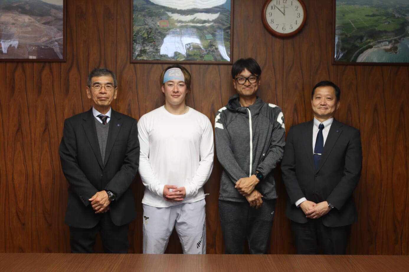 12月23日には、吉田選手と帯同する和田照茂トレーナーが金久博昭学長と前田明理事・副学長を表敬訪問。懇談の中で吉田選手は、手術後のリハビリ状況などについて語り、学長からは「鹿屋は静かで集中できる環境。ここでの努力が必ず力になる」と激励の言葉が送られました。