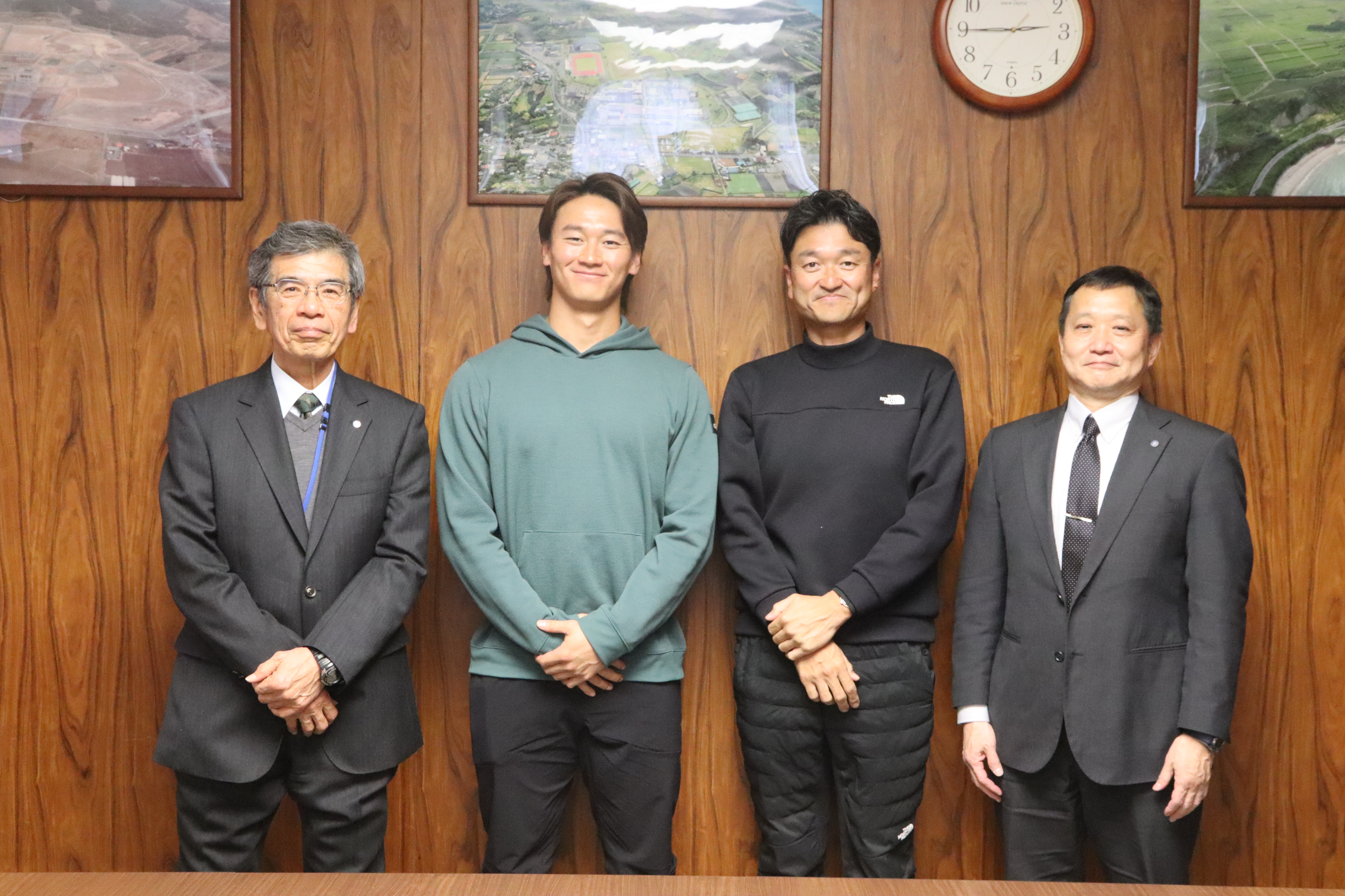 自主トレ開始前日の2月2日には、森木選手と帯同する和田照茂トレーナーが本学を訪れ、金久博昭学長、前田明理事・副学長を表敬訪問しました。懇談では、今後の目標や今季に向けた意気込みなどについて、和やかに意見を交わしました。