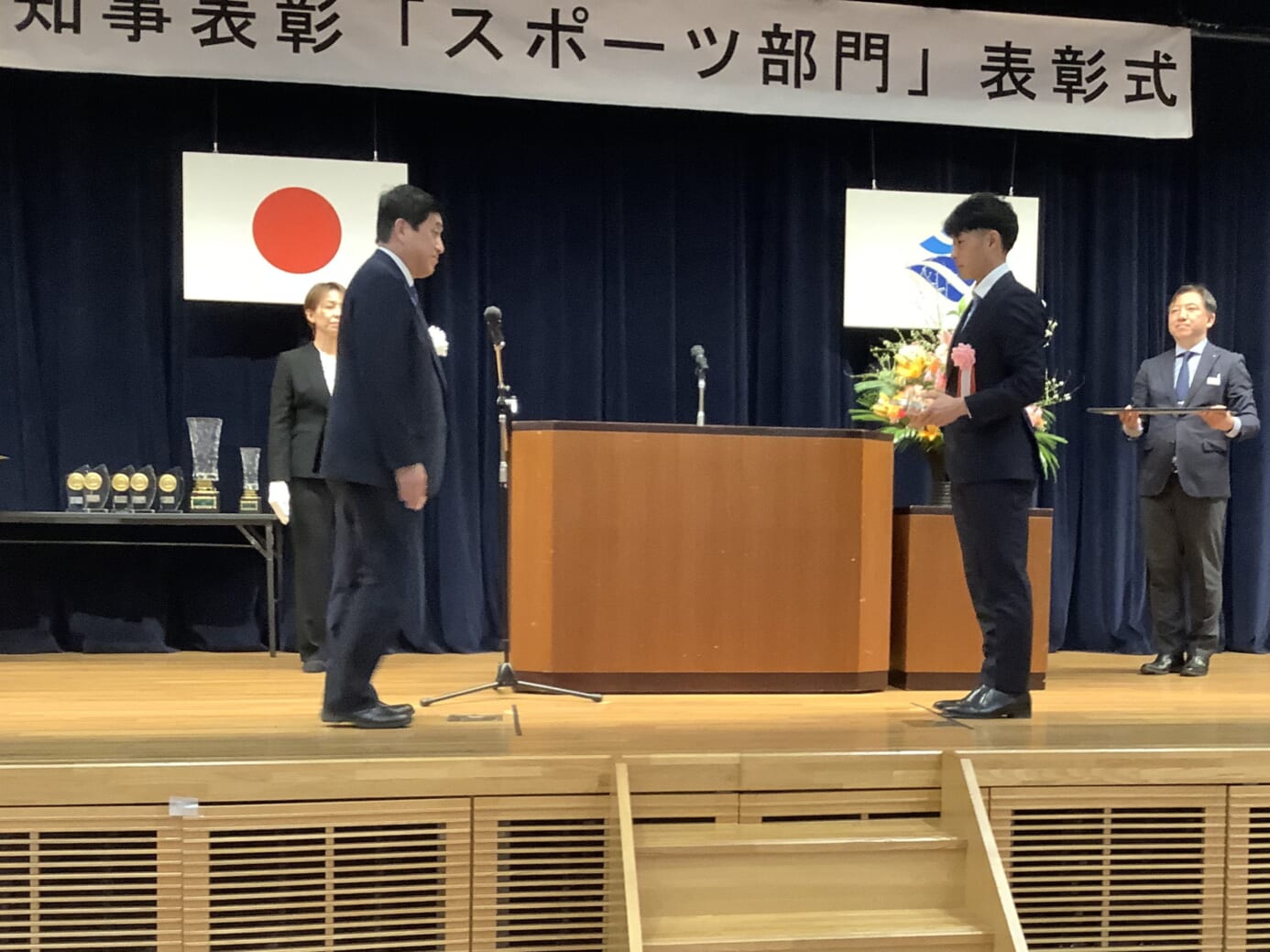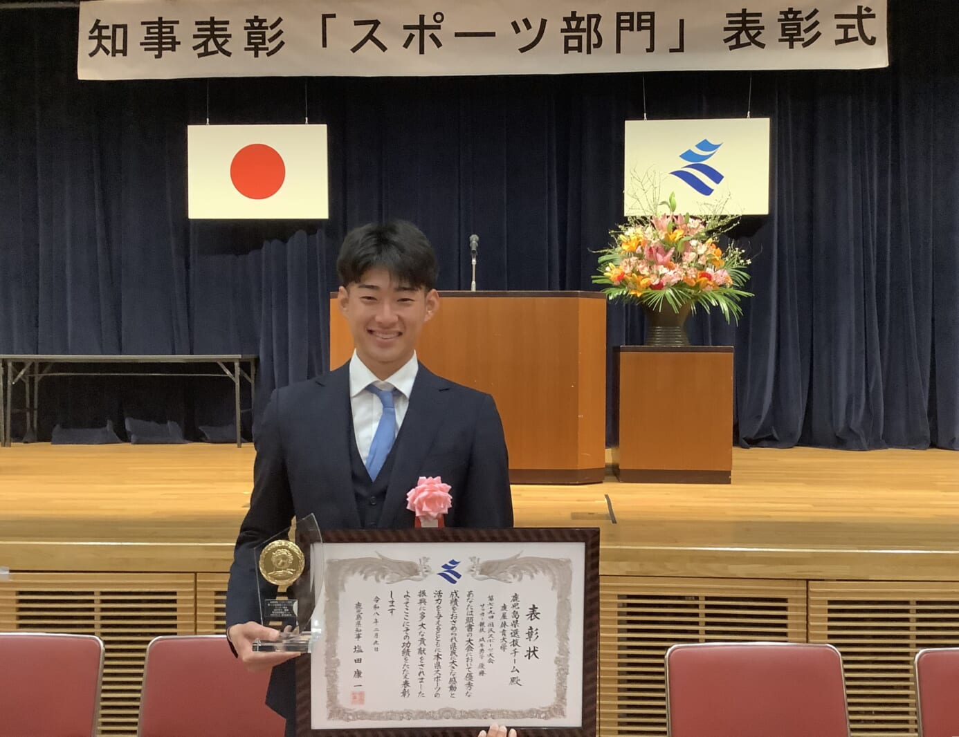 「成年男子県選抜チーム」として国スポに出場して優勝した本学サッカー部も団体表彰を受け、チームメンバーを代表して出席した野村祐暉さん(スポーツ総合課程3年)に、塩田康一知事から表彰状や盾などが贈られました。次期主将に就任することが決まっている野村さんは、表彰式終了後に「国スポという全国規模の大会で優勝できたことは、素直にうれしく思います。本日の表彰式で他の受賞者の皆さんと同席させていただいたことは、大きな刺激になりました。“これまでの鹿屋体育大学サッカー部のすべてを超えていく”ということを目標に、日々の練習や試合に今まで以上に全力で取り組めるチームをつくり上げていきたいと思います。サッカーの試合結果や地域貢献活動等で、鹿児島県を盛り上げられるように今後も取り組んで参ります」とコメントしました。