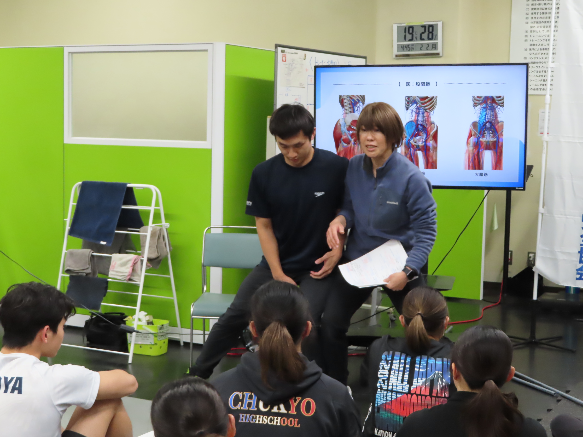 セミナーは「スポーツ基本動作から考えるパフォーマンスアップとケガ予防 ~解剖学と運動連鎖で理解するトレーニング選択とフォーム~」と題し、モニターに解剖学で使用されるような身体の作りを図示し参加者の姿勢について評価することや、体幹の維持・強化のための姿勢やそれを応用し力を入れなくても倒れにくい姿勢など、参加者自身が要所で実践する演習方式で行われ、参加者は終始講師の話を真剣に聞き入っていました。