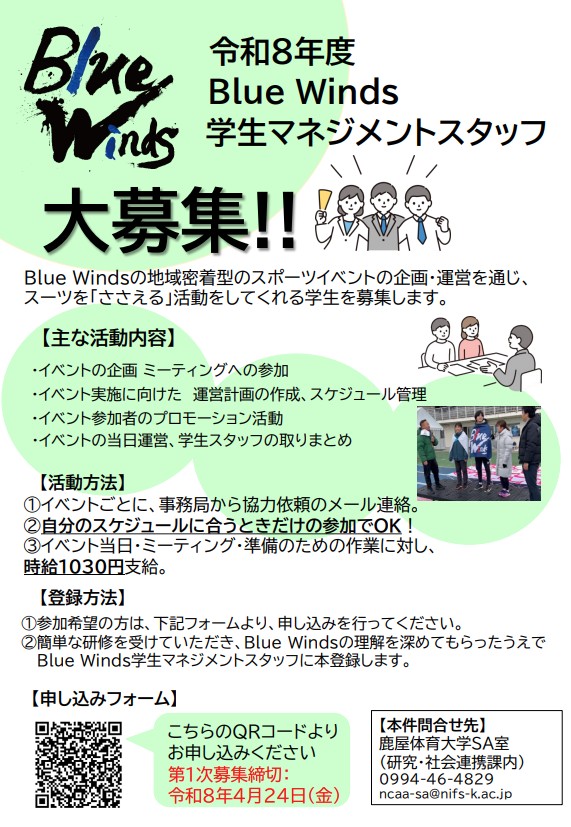 鹿屋体育大学と鹿屋市の地域密着型スポーツブランド『Blue Winds』を 一緒に盛り上げてくださるBlue Winds学生マネジメントスタッフを募集しています。